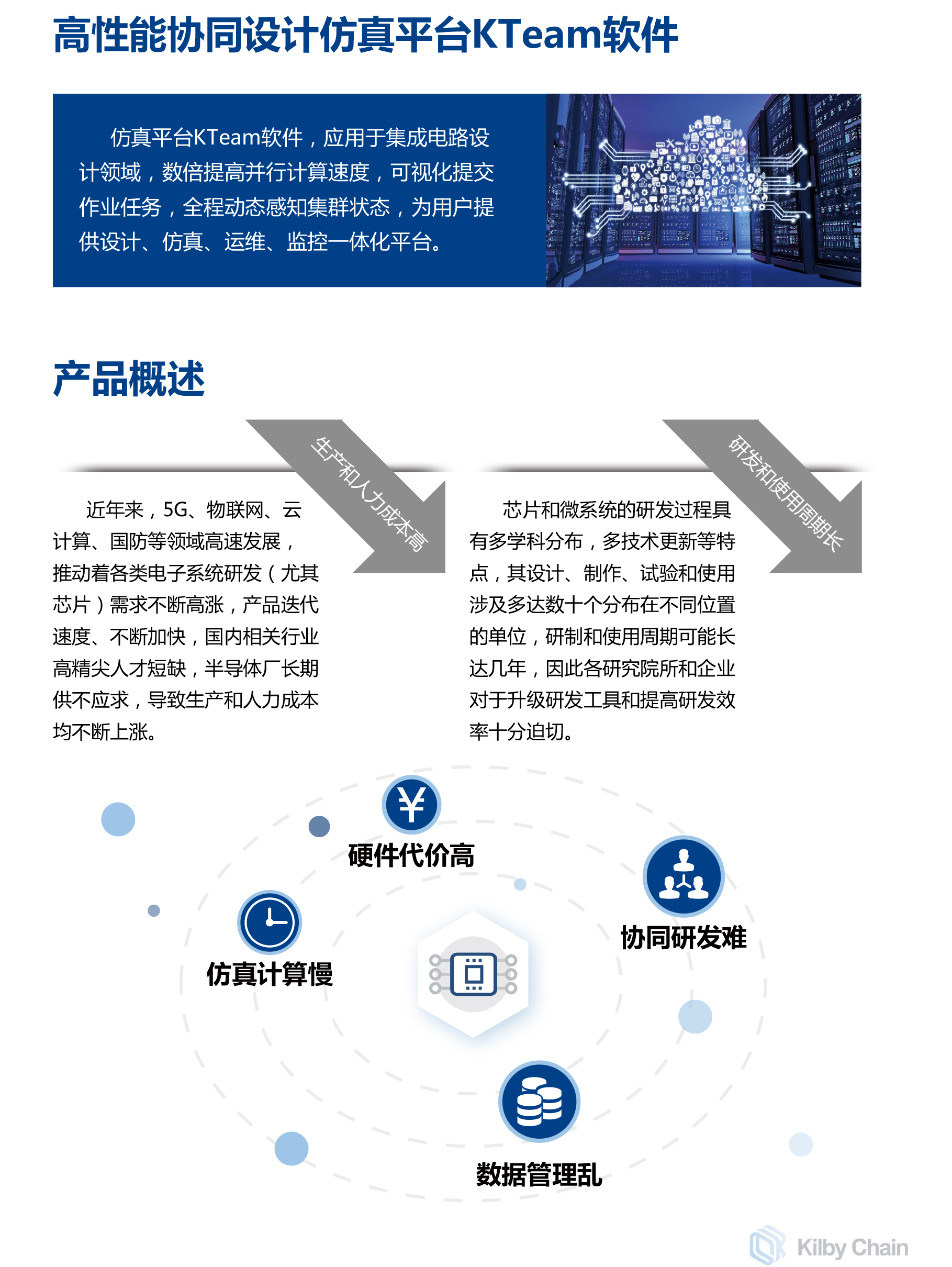 KTeam是基尔科技自主研发的高性能协同设计仿真软件平台,可实现设计与计算集群资源统一部署、使用、浏览、管理、监控和统计等,可大幅提高仿真效率,简化平台管理。KTeam由应用工作台、作业调度模块、文件管理模块、集群监控模块、资源统计模块组成。选用KTeam及其相关服务,可以帮助用户部署操作系统,安装和测试集群软件以及应用环境,基于高性能集群硬件设备,提供传统的设计环境和高速的仿真体验。